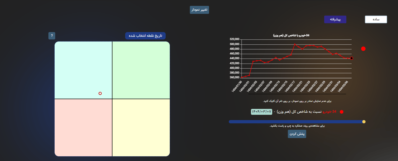 کافیست وارد سایت توسود شوید و از منوی ابزارها، روی گزینهی نمودار کلیک کنید. با این کار، دو حالت برای مشاهده نمودار در اختیار شما قرار میگیرد: نمودار ساده و نمودار پیشرفته. اگر به دنبال جزئیات تحلیلی بیشتری هستید، حالت پیشرفته انتخاب مناسبتری است. اما اگر تحلیلهای سادهتر و تصویری میخواهید، حالت ساده پاسخگوی شماست.
